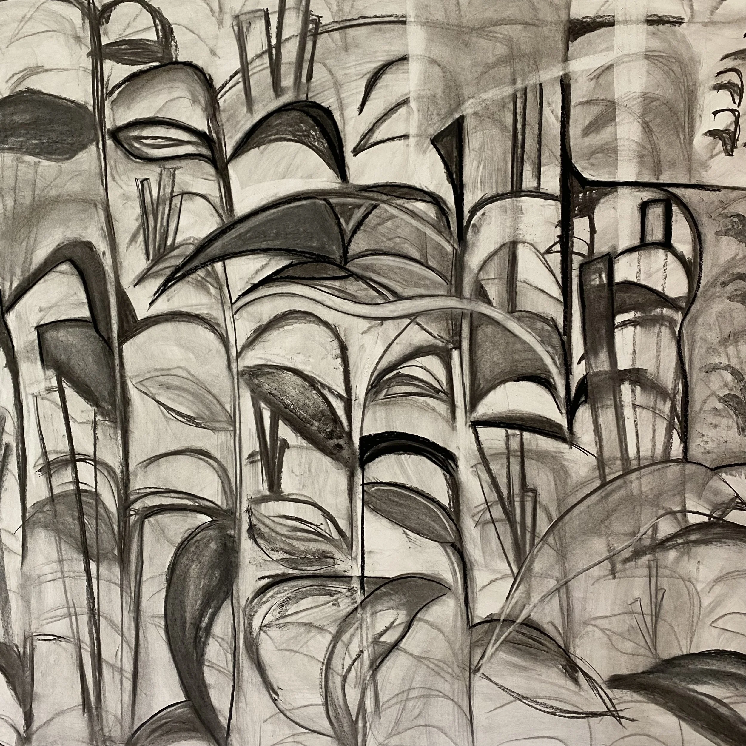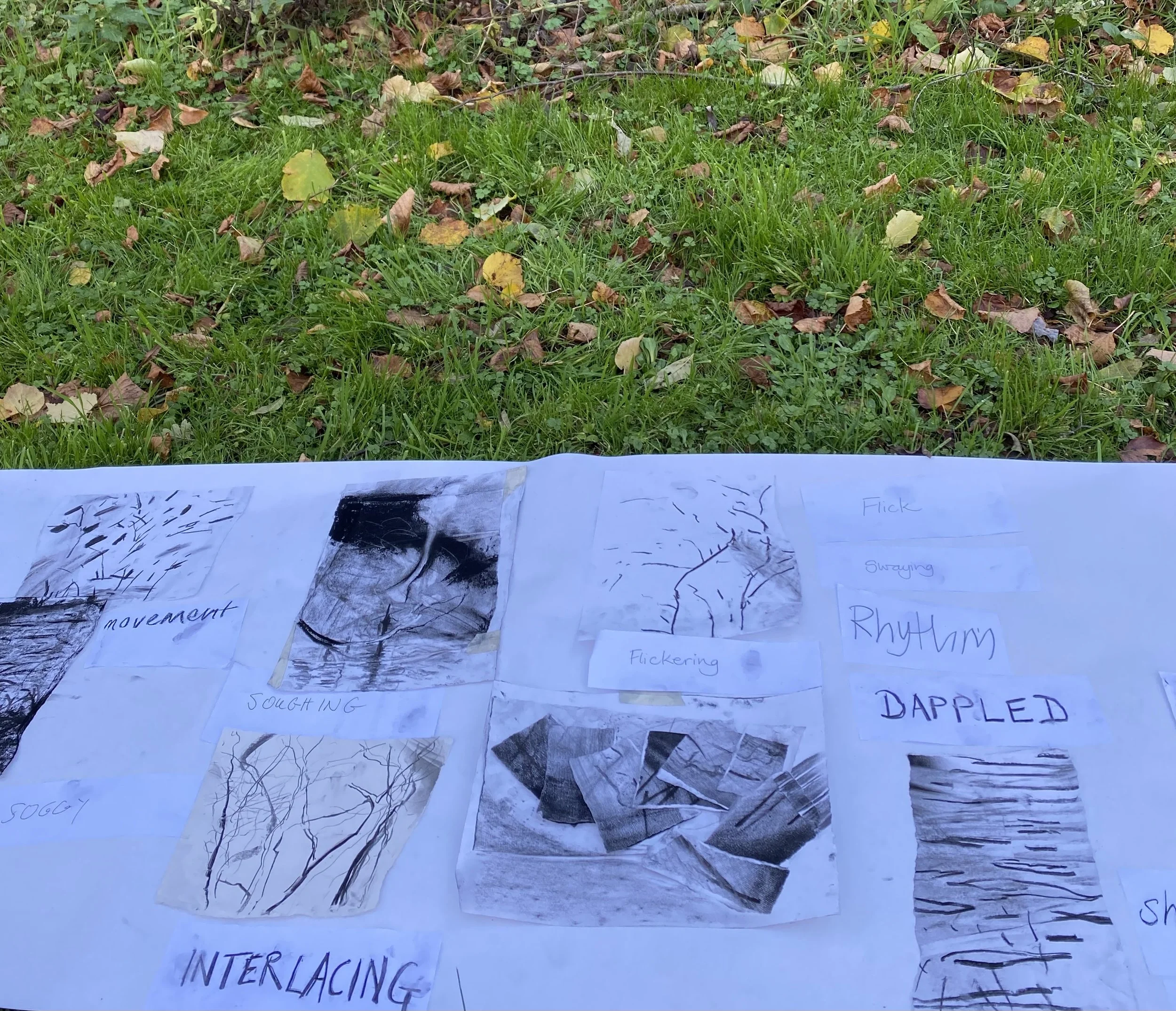 Back in the studio we draw intuitively, from memory, full body and gestural. Large-scale charcoal drawings that layer and change and keep going over many hours and days. We will be making smaller drawings too. Sometimes drawing into the evening, in low light, from dreams, from the subconscious, from the landscape half-remembered.